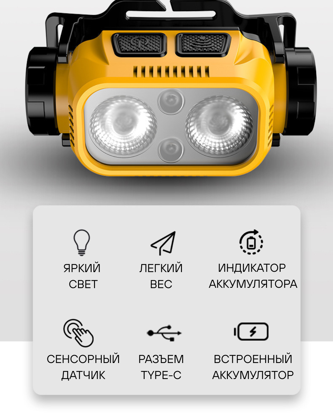 Особенности: индикатор уровня заряда, ремешок, разъем USB Type-C, датчик движения, стробоскоп